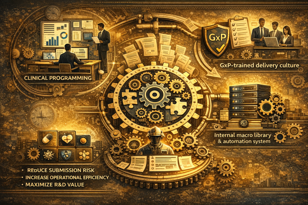 With deep focus in biometrics and regulatory submission standards, we help sponsors strengthen compliance, streamline delivery, and improve productivity—without compromising quality. Our team combines hands-on clinical research experience with rigorous programming and documentation practices, enabling sponsors, other service providers, and related organizations to scale resources efficiently across studies and timelines.